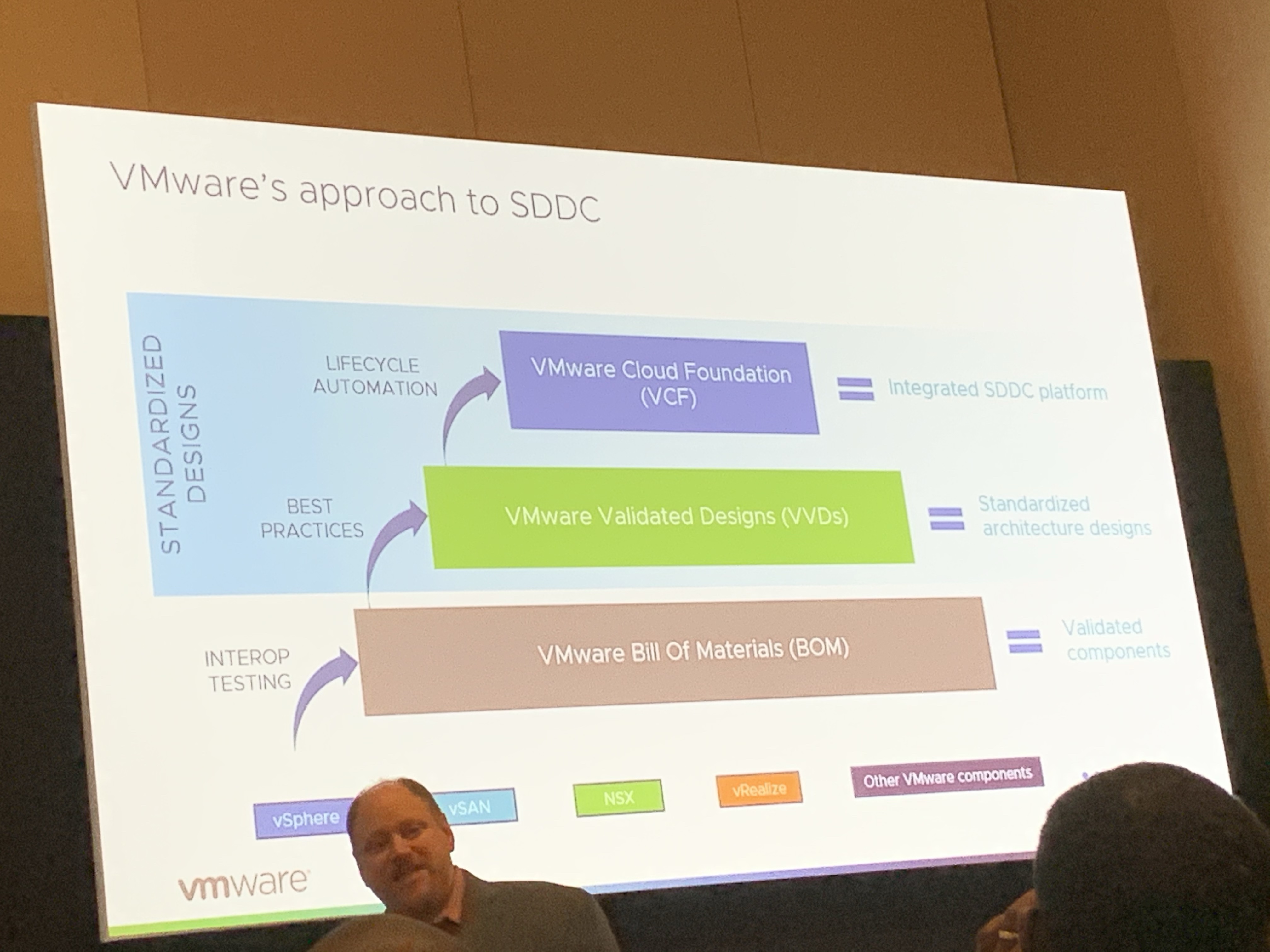 Today this session was pretty interesting. It was good seeing how the VMware Validating Designs and Cloud Foundation have evolved over the last years. For the ones not knowing the difference between VVD and VCF the following slide shows the difference.