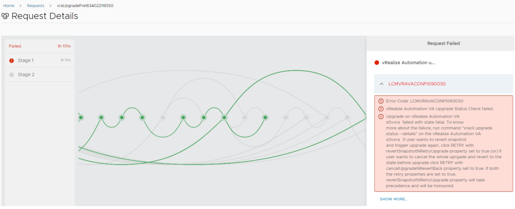 During the upgrade to version 8.4.1 the upgrade failed after about 1,5 hours. The error message in SDDC Manager doesn’t show much information about what happened.