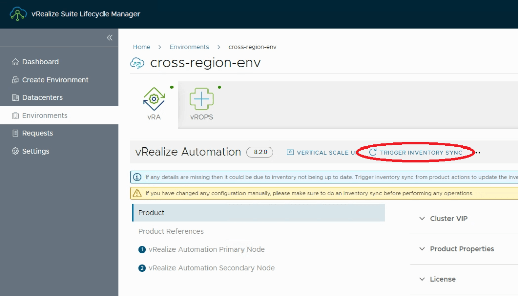 Ok, VRA has been upgraded successfully but how do we let SDDC Manager know? As vRLCM is managing the VRA environment we have to start there. Just trigger an Inventory Resync from the Enviroments page.